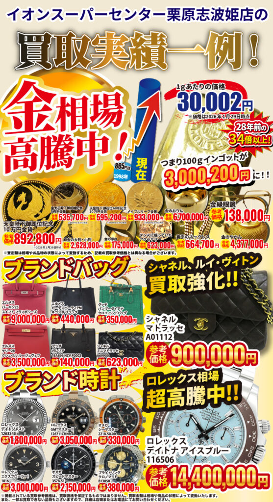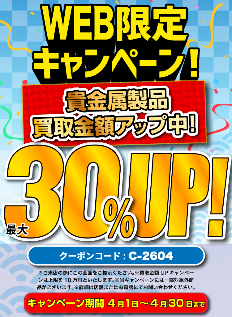 キャンペーン実施店舗 よくあるご質問 買取価格は主にどんな要素から決まるのでしょうか? お品物の状態や付属品の有無、最新相場、流通量などによって買取価格を算出します。 どんなものを買い取ってもらえますか? 金・貴金属・ブランド品はもちろん、お値段がつくか迷われているものも是非お持ちください。 傷や汚れのあるアイテムでも買取可能ですか? 大歓迎です。未使用品などのお持ち込みは少なく、傷や汚れのあるアイテムをお持ちいただく方が半数以上です。状態の悪いお品物やカビなどがあってもお買取可能なケースもございます。 どんな情報があればすぐに査定額を教えてもらえますか? お品物の名前や種類、状態、またはブランド名、型番などの情報があると、概ねの査定額をお伝えできるかと思います。 店舗での査定時間はどのくらいですか? お品物の種類や個数にもよりますが、約5分から30分ほどの査定時間となるケースが多いです。事前にある程度の査定時間をお伝えいたしますので、ご安心ください。